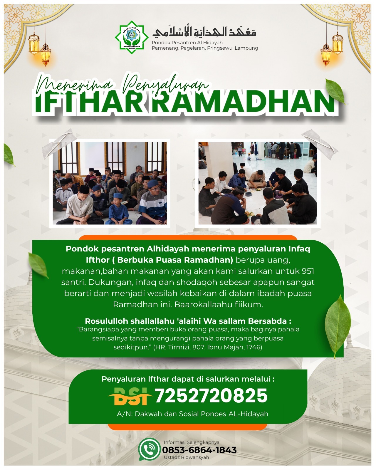 Pondok Pesantren Al Hidayah menerima penyaluran infaq ifthor (Berbuka Puasa Ramadhan) berupa uang, makanan, ba ... Selengkapnya